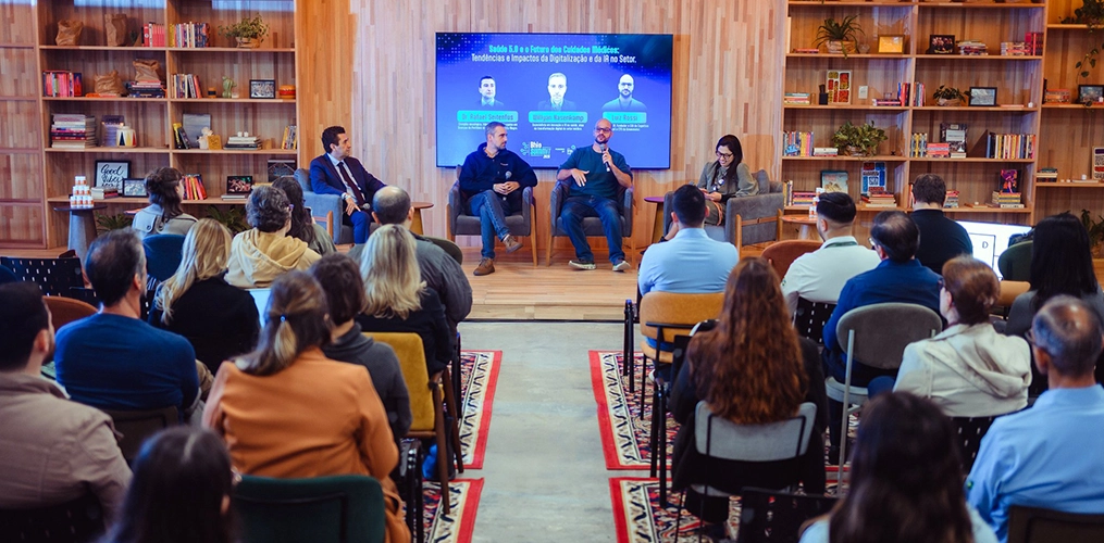 Encerrando o evento, o painel com Dr. Pedro Henrique Morais, Paulo Ferreira e Rubens Oleinski abordou as tendências mais futuristas do setor, como sensores biométricos, wearables e medicina personalizada, apontando caminhos para um cuidado mais centrado no indivíduo.