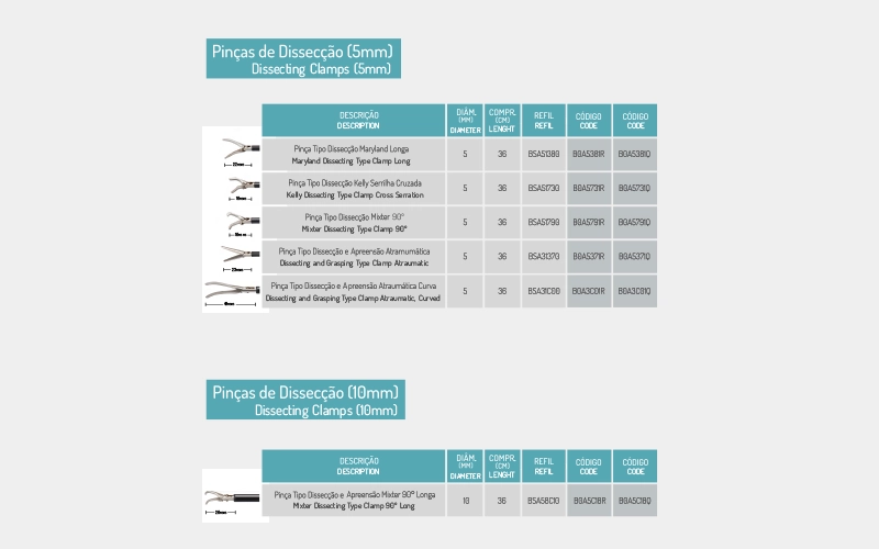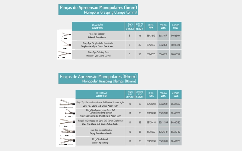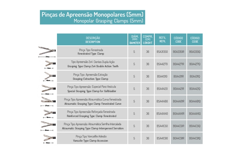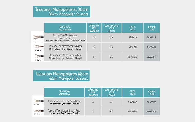 Tesouras monopolares 5 mm – tipos Metzembaum, reta, curva e gancho, 36 cm e 42 cm, com engate rápido plug‑and‑play. Confira todas as opções de tesouras no catálogo. Faça o download abaixo.